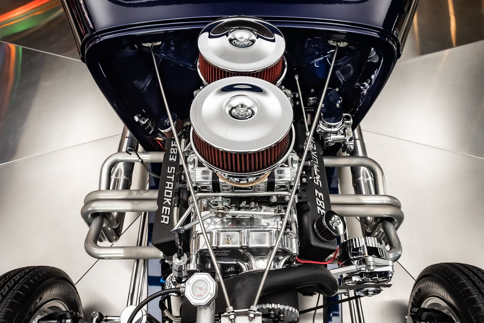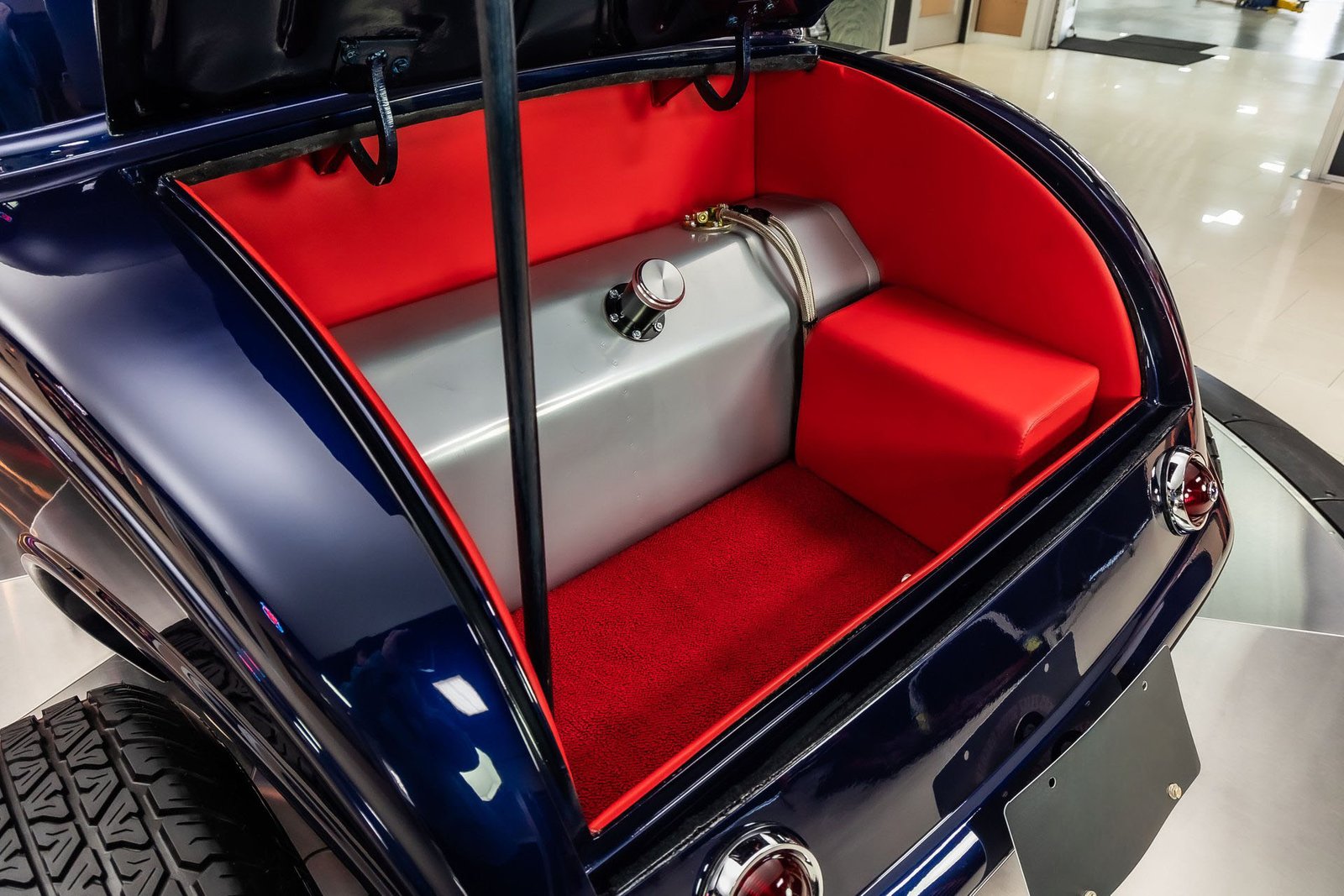 This example is a professionally built street rod completed in 2017, blending classic hot rod design with modern performance and comfort. Finished in a deep dark blue, the fiberglass-bodied coupe presents a clean, aggressive stance with exposed mechanicals that perfectly suit its hot rod personality. The open-engine layout and side-exit exhaust give it a purposeful look that immediately commands attention.