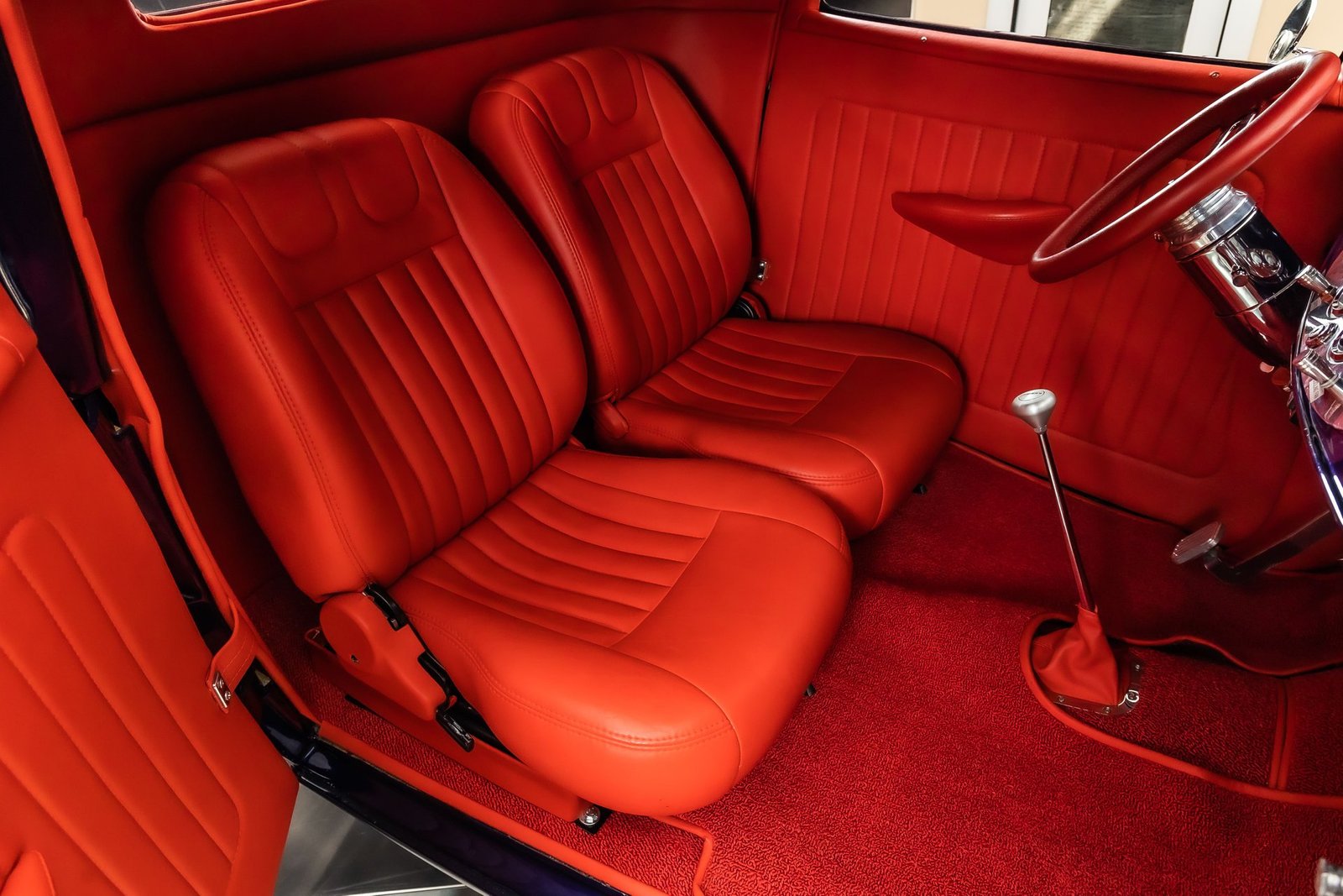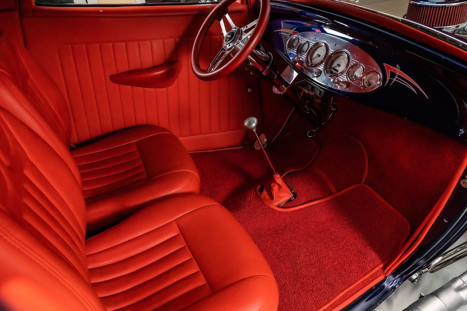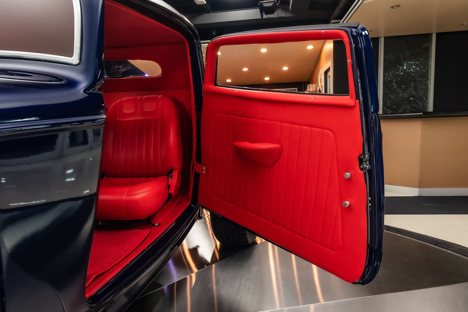 Inside, the red interior adds bold contrast and a refined touch. Modern gauges, power windows, tilt steering, and quality hardware create a cockpit that’s both comfortable and functional without losing the raw appeal of a traditional hot rod. Built to be driven and enjoyed, this 3-window coupe captures the spirit of classic hot rodding with modern reliability and performance.
