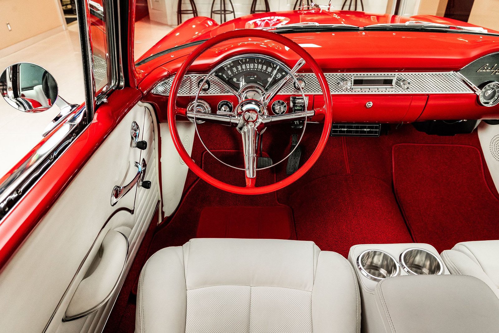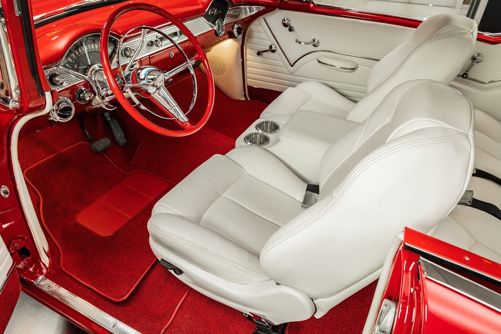 Finished in a striking red and white exterior, the body presents with laser-straight panels and mirror-like paint that highlight the iconic Tri-Five silhouette. Inside, the cabin features custom seating, upgraded interior trim, and thoughtful conveniences that make the car enjoyable for long drives or car show weekends. The fully finished trunk and clean undercarriage further reflect the high level of craftsmanship throughout the build.