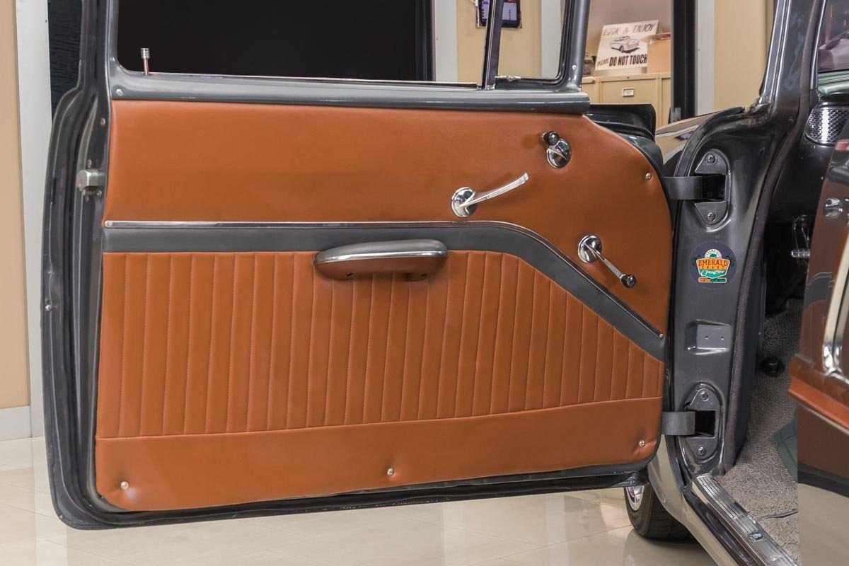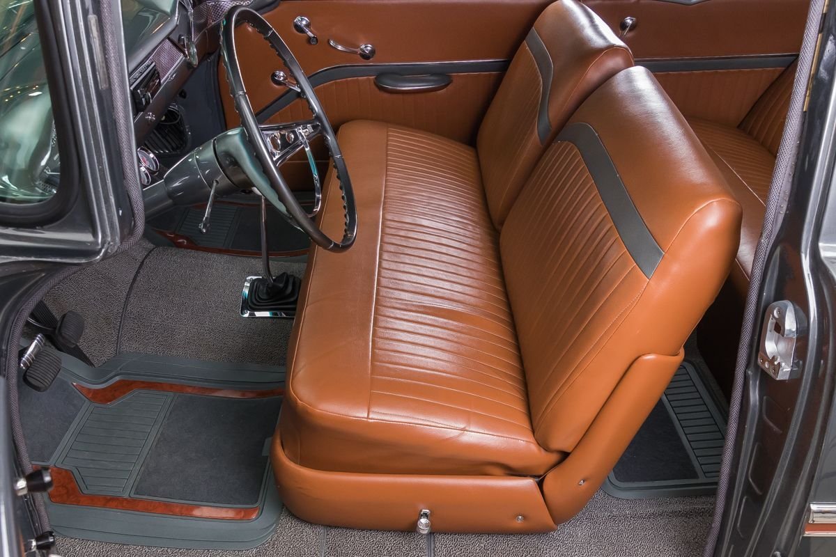 This example has benefited from a complete frame-off, nut-and-bolt rotisserie restoration, resulting in a car that presents beautifully from every angle. With very limited mileage since completion, it retains the fresh, tightly assembled feel enthusiasts look for in a high-quality restoration. Finished in a striking graphite gray, the exterior highlights the Bel Air’s crisp lines and polished trim, while the lowered stance gives it a subtle, modern edge without losing its classic identity.