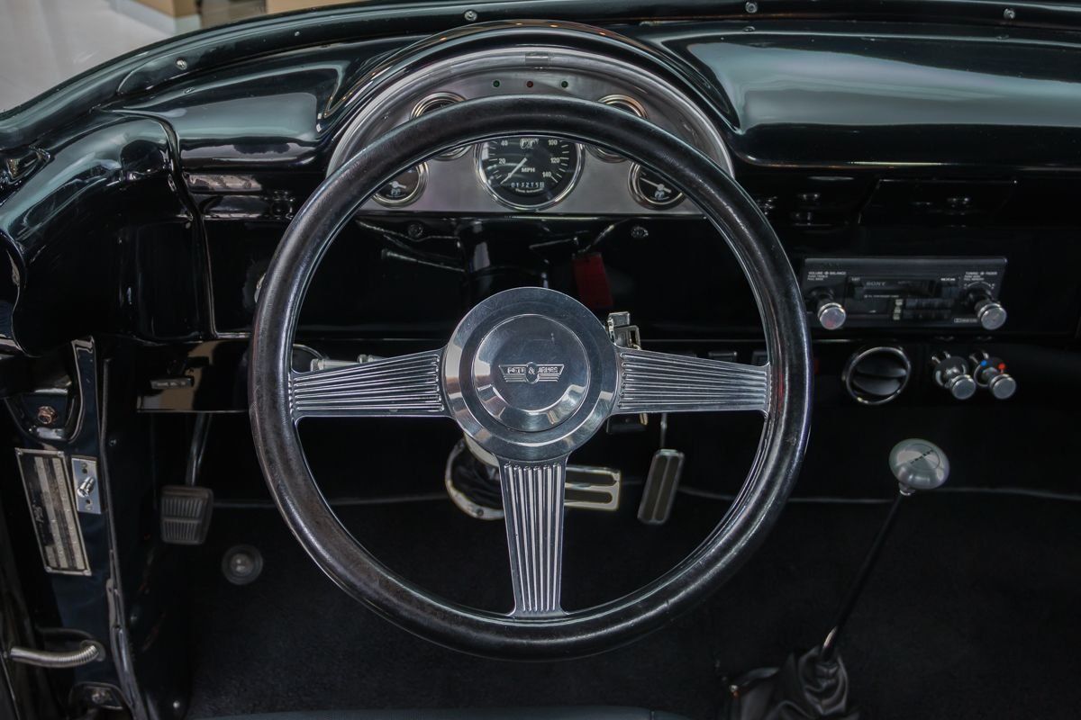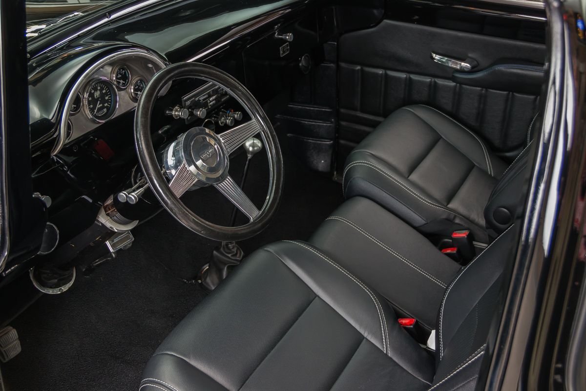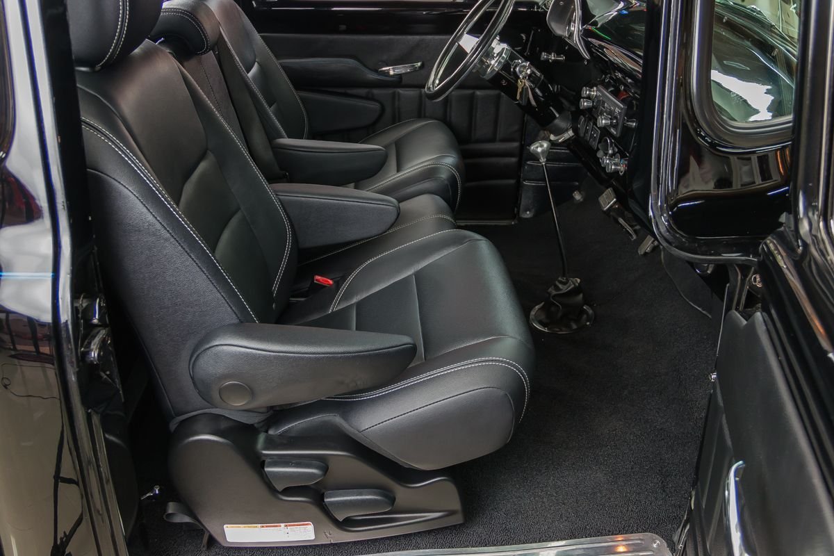 This example is an all-steel truck that has undergone an extensive frame-off, nut-and-bolt build with a strong emphasis on quality, drivability, and subtle customization. Finished in high-gloss black, the body presents with a smooth, refined appearance that highlights the truck’s iconic lines. Thoughtful custom touches—such as the recessed tailgate latch, smoothed roll pan, and oak wood bed—enhance the look without straying from the truck’s classic identity.