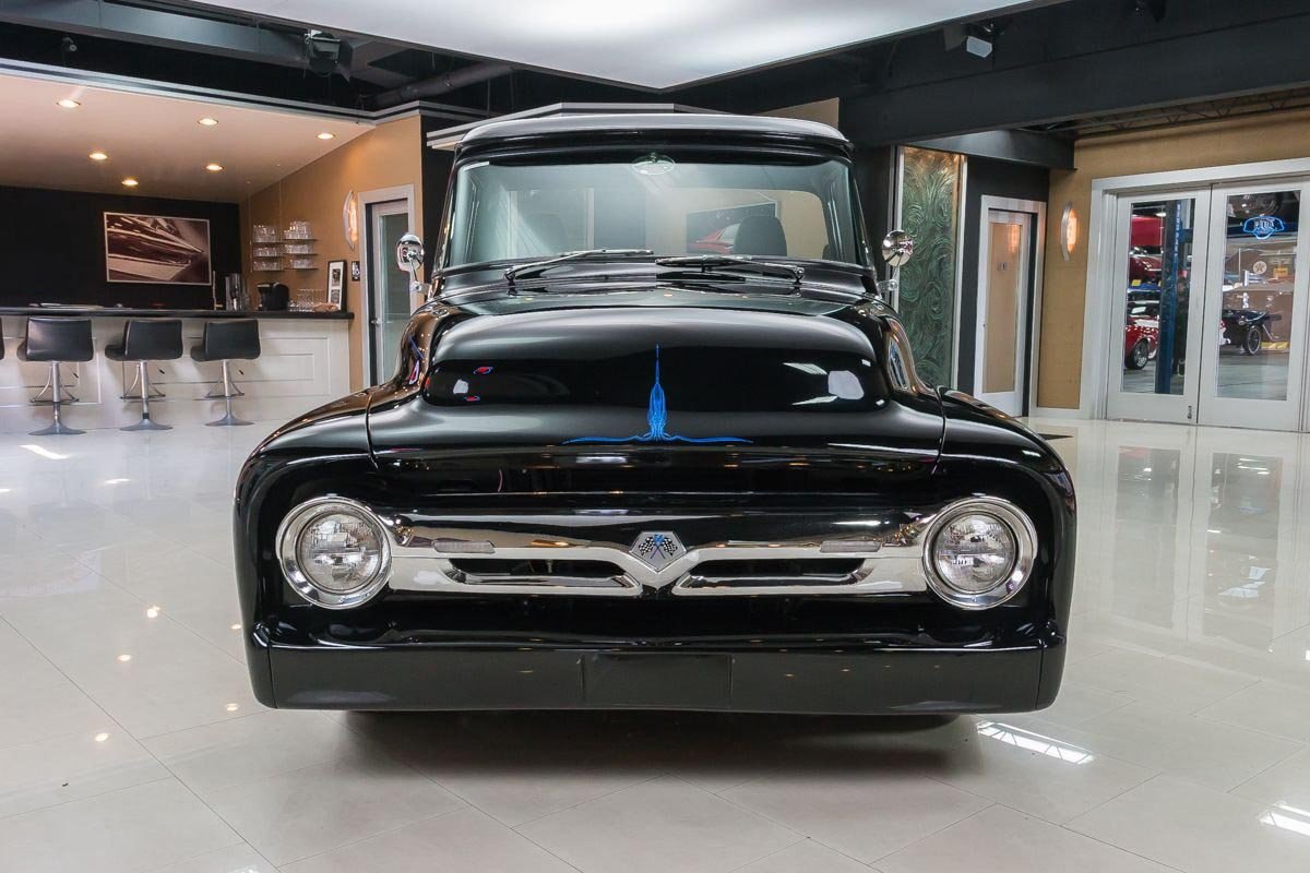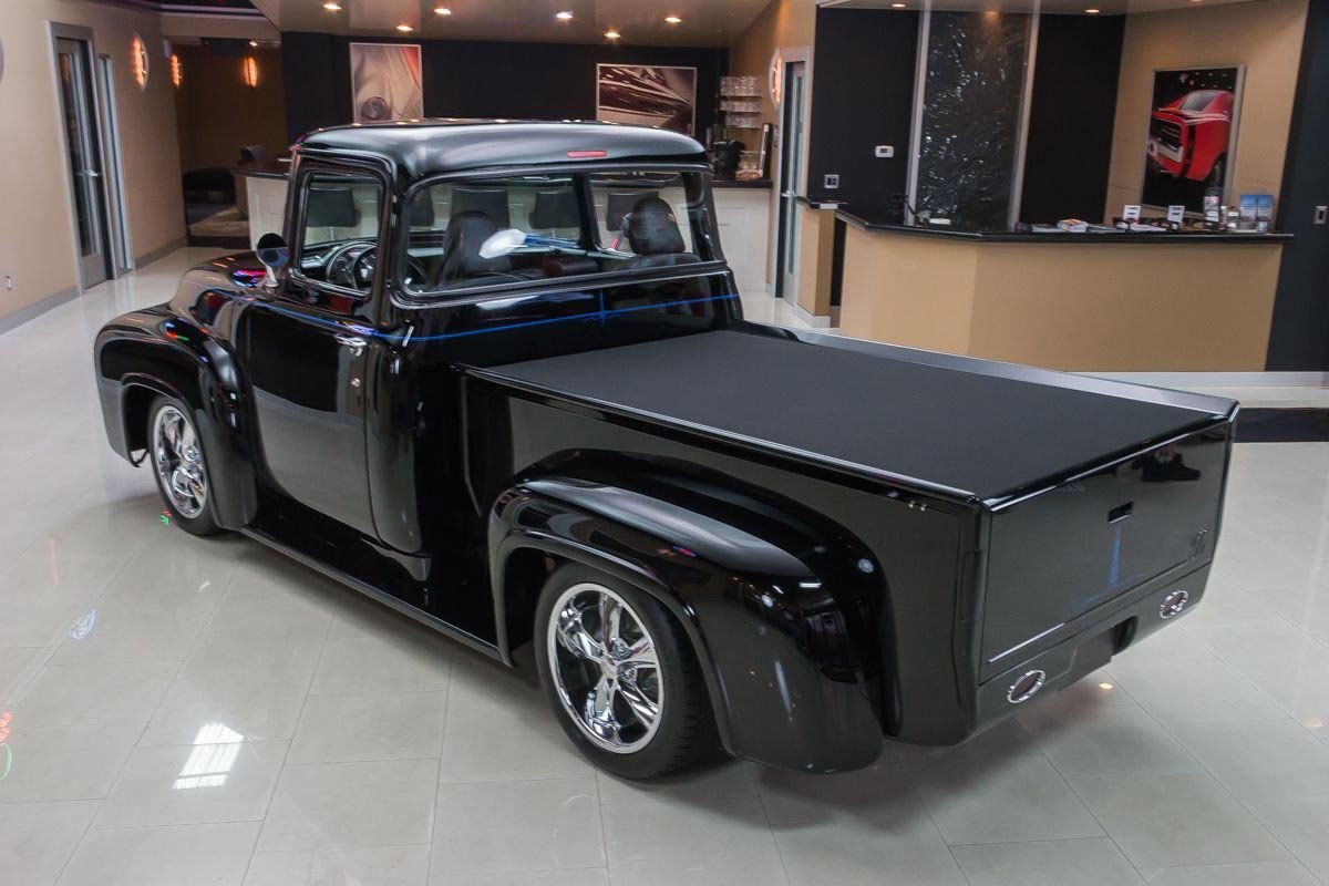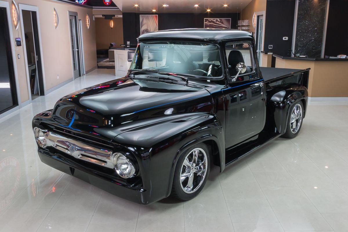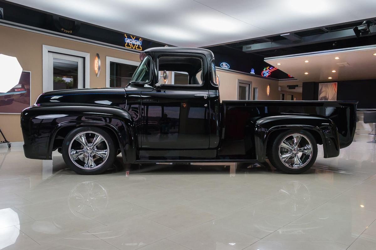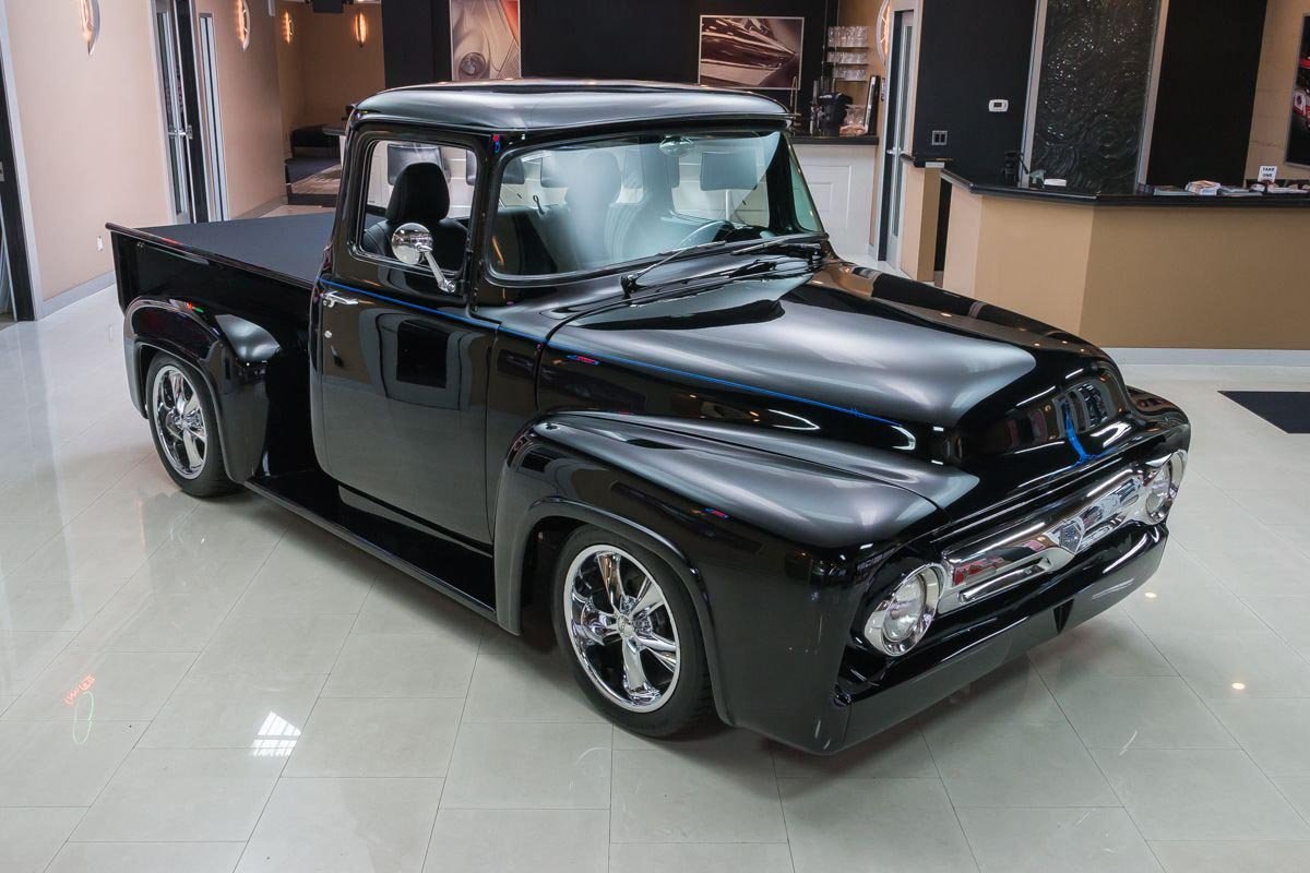 Inside, the cabin has been transformed into a comfortable, well-appointed environment. Leather seating, custom instrumentation, and modern conveniences create a refined interior that complements the truck’s exterior presentation. Altogether, this 1956 F100 Big Window delivers classic Ford truck style backed by modern performance and comfort, making it a standout custom pickup built to be driven and enjoyed.