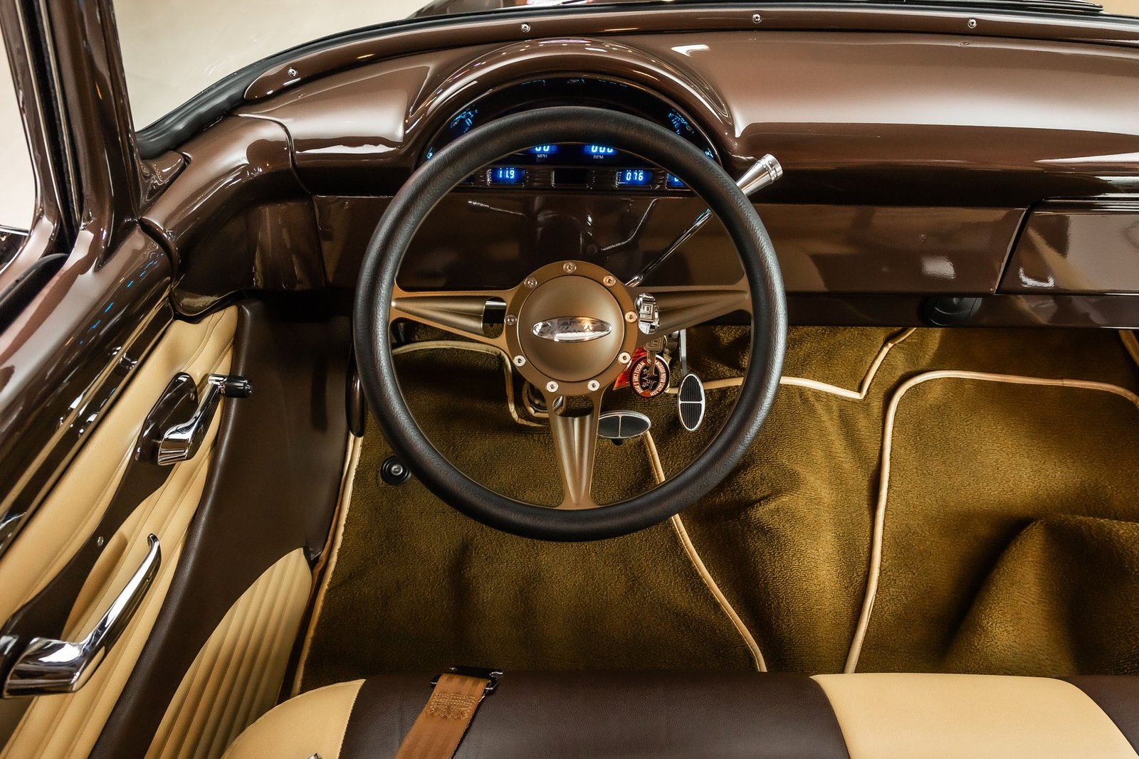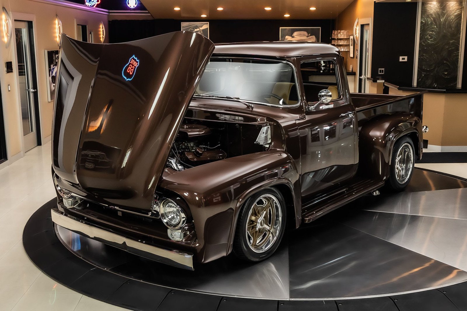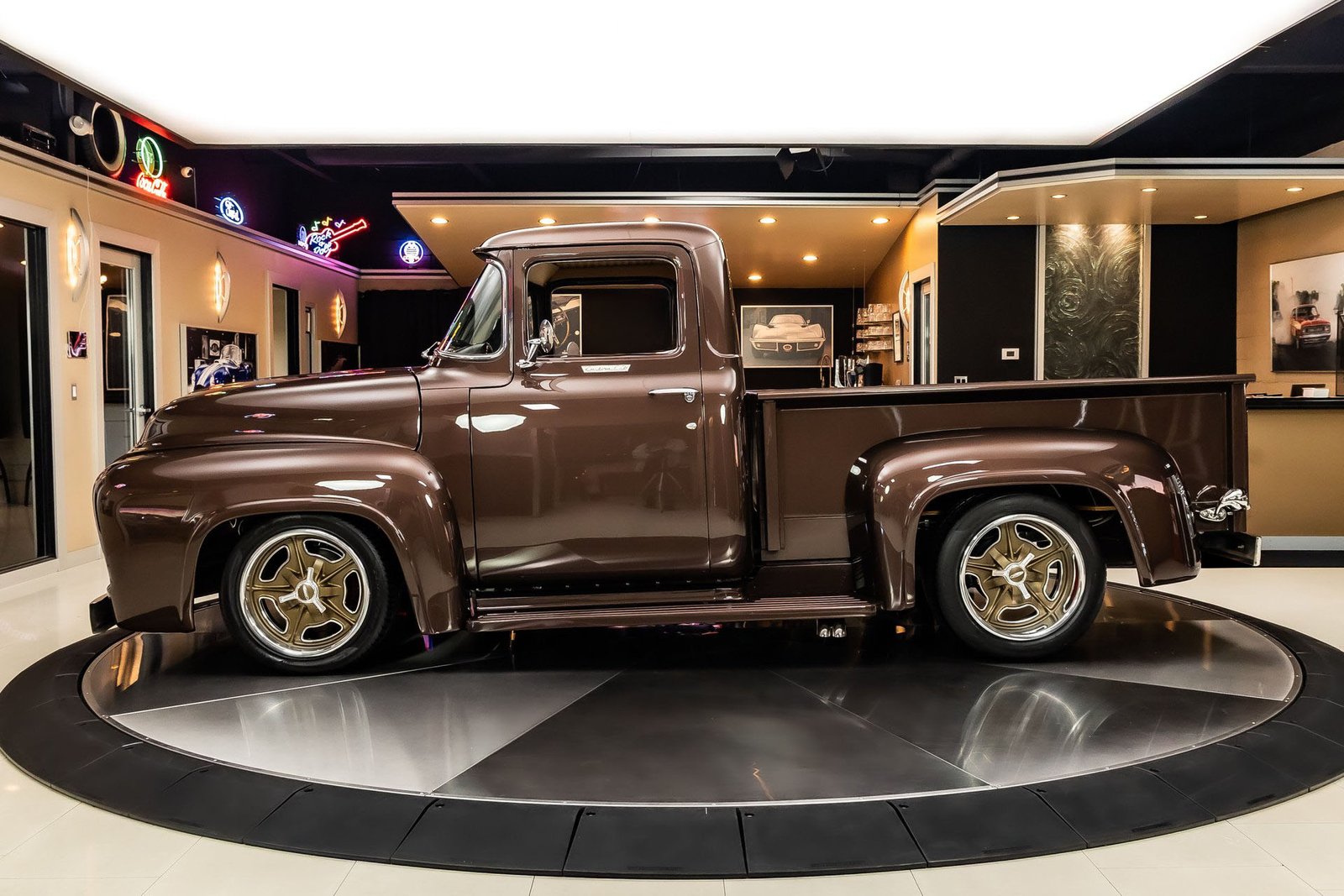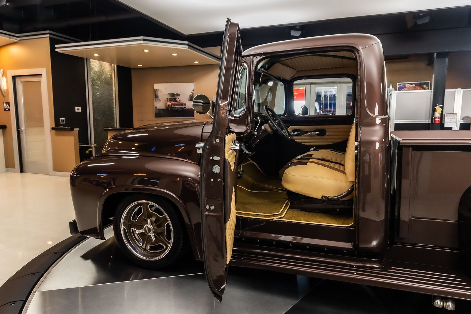 Finished in a rich Cherrywood Bronze exterior, the truck presents with a beautifully detailed body that highlights the iconic shape of the ’56 F100. Subtle custom touches, paired with polished trim and modern wheels, give it a refined appearance without losing its vintage character. The stance and overall presentation reflect the benefits of a frame-off build, resulting in a truck that looks purposeful from every angle.