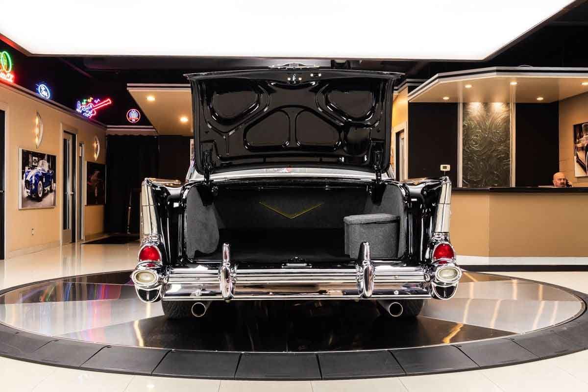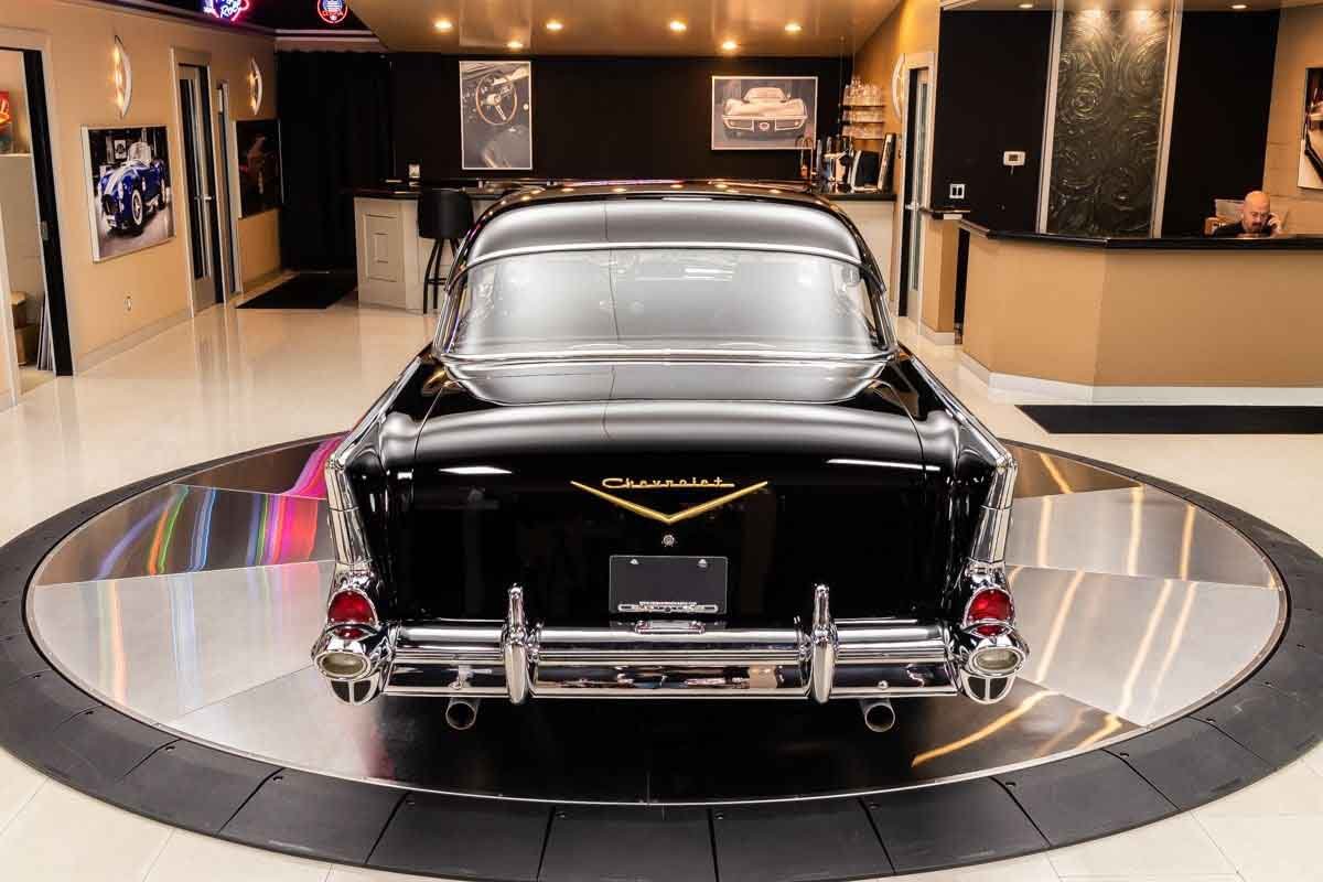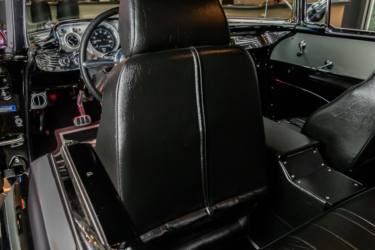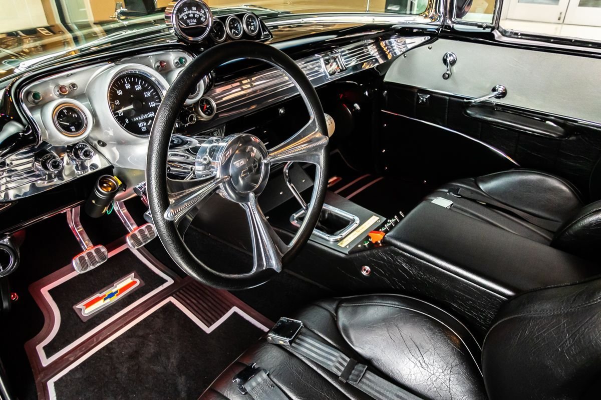 Finished in glossy black, the exterior showcases straight body lines, polished trim, and classic chrome bumpers that highlight the Bel Air’s legendary design. Inside, the custom black interior combines classic proportions with modern touches, including upgraded seating, a center console, and contemporary instrumentation. The result is a striking Tri-Five Chevrolet built to impress at shows while remaining fully capable of being driven and enjoyed.
