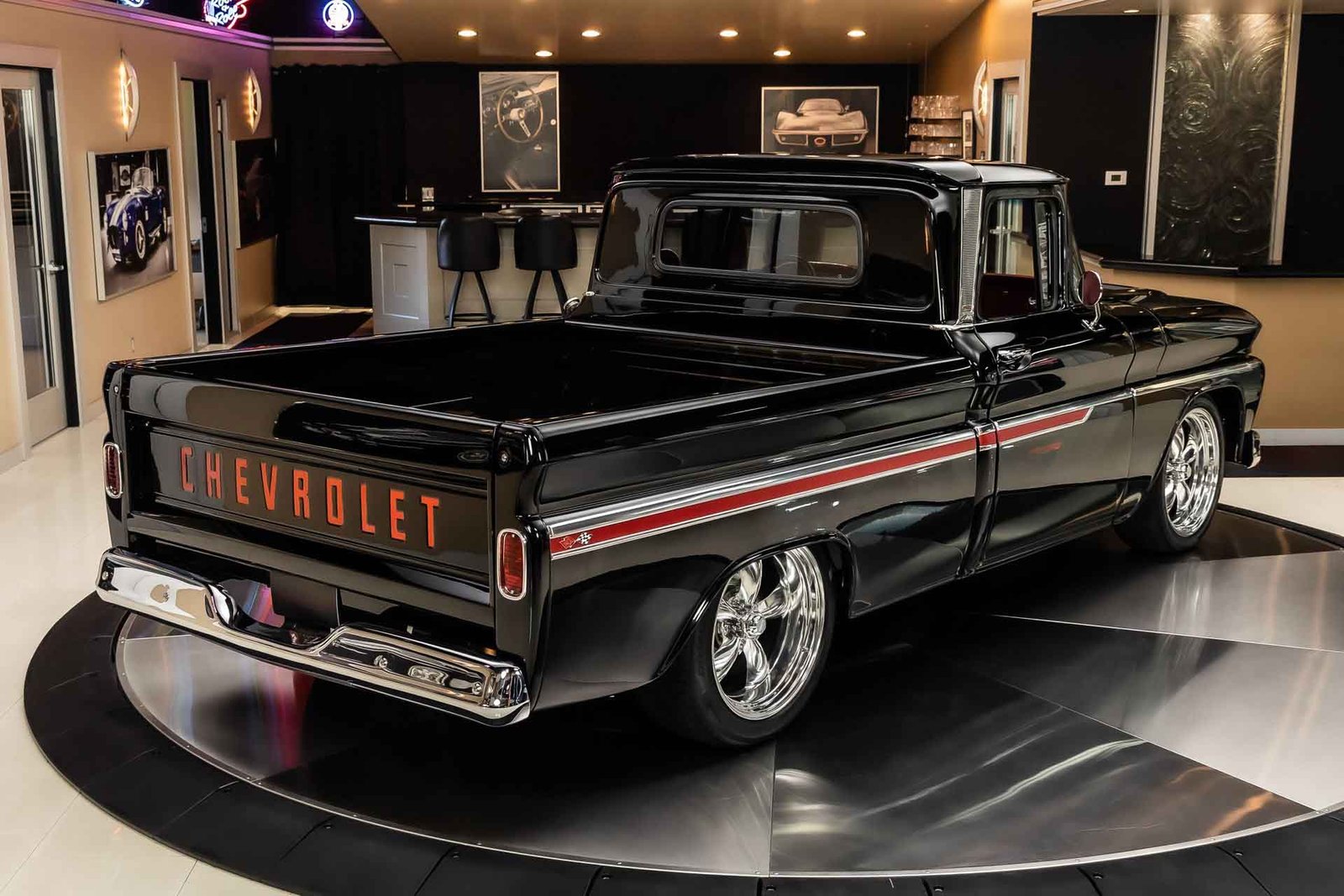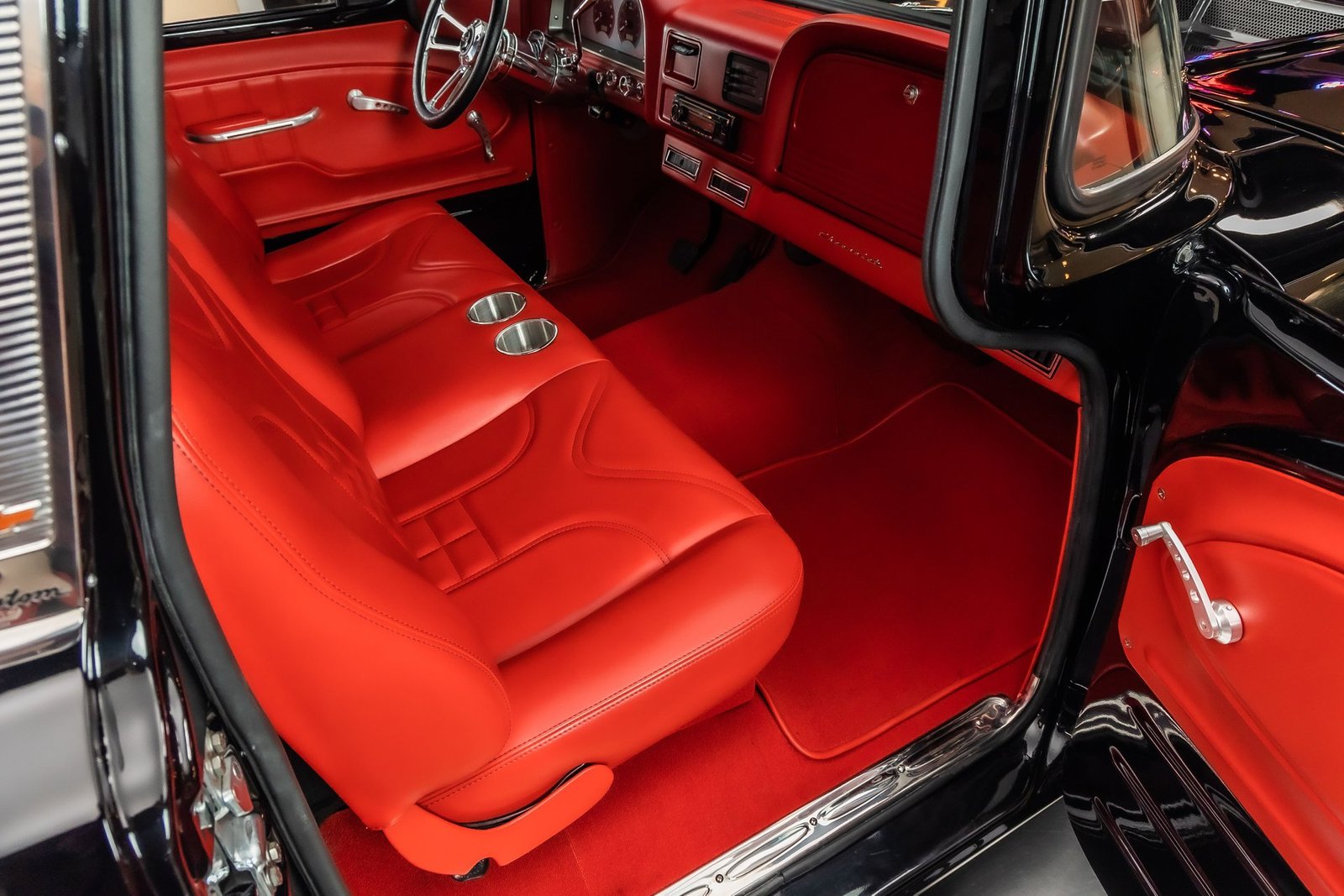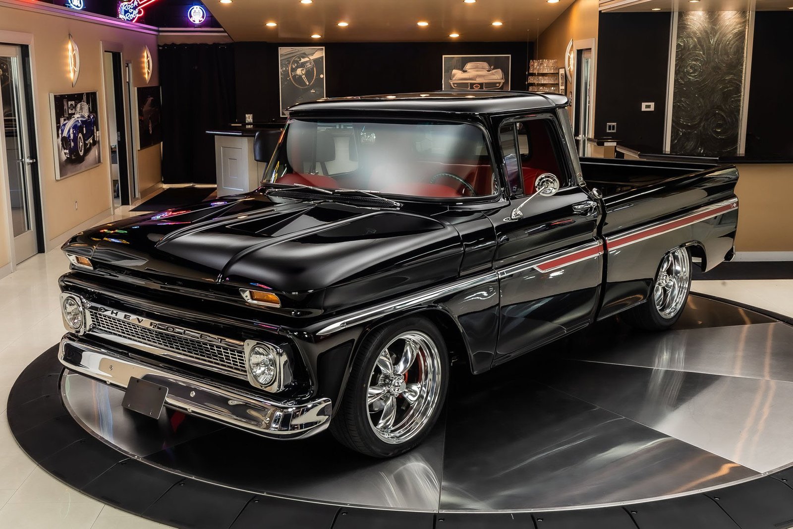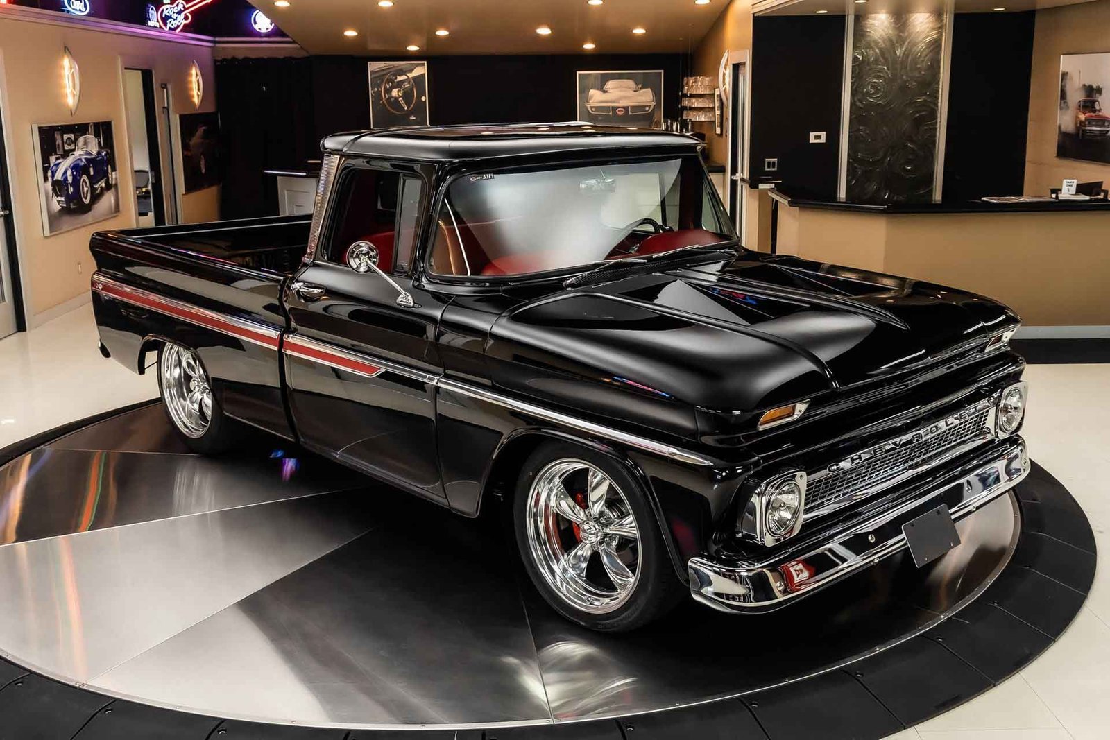 Finished in black with tasteful chrome accents, the exterior presents a clean, aggressive look that highlights the C-10’s timeless design. Inside, the custom red interior adds a bold contrast and provides a comfortable, well-finished cabin with modern touches. From the oak bed floor to the detailed undercarriage, this pickup reflects the level of care and attention expected from a high-quality restoration built to be driven and enjoyed.