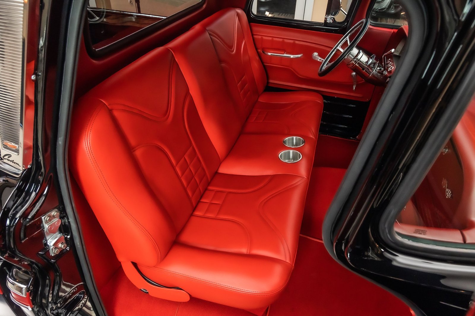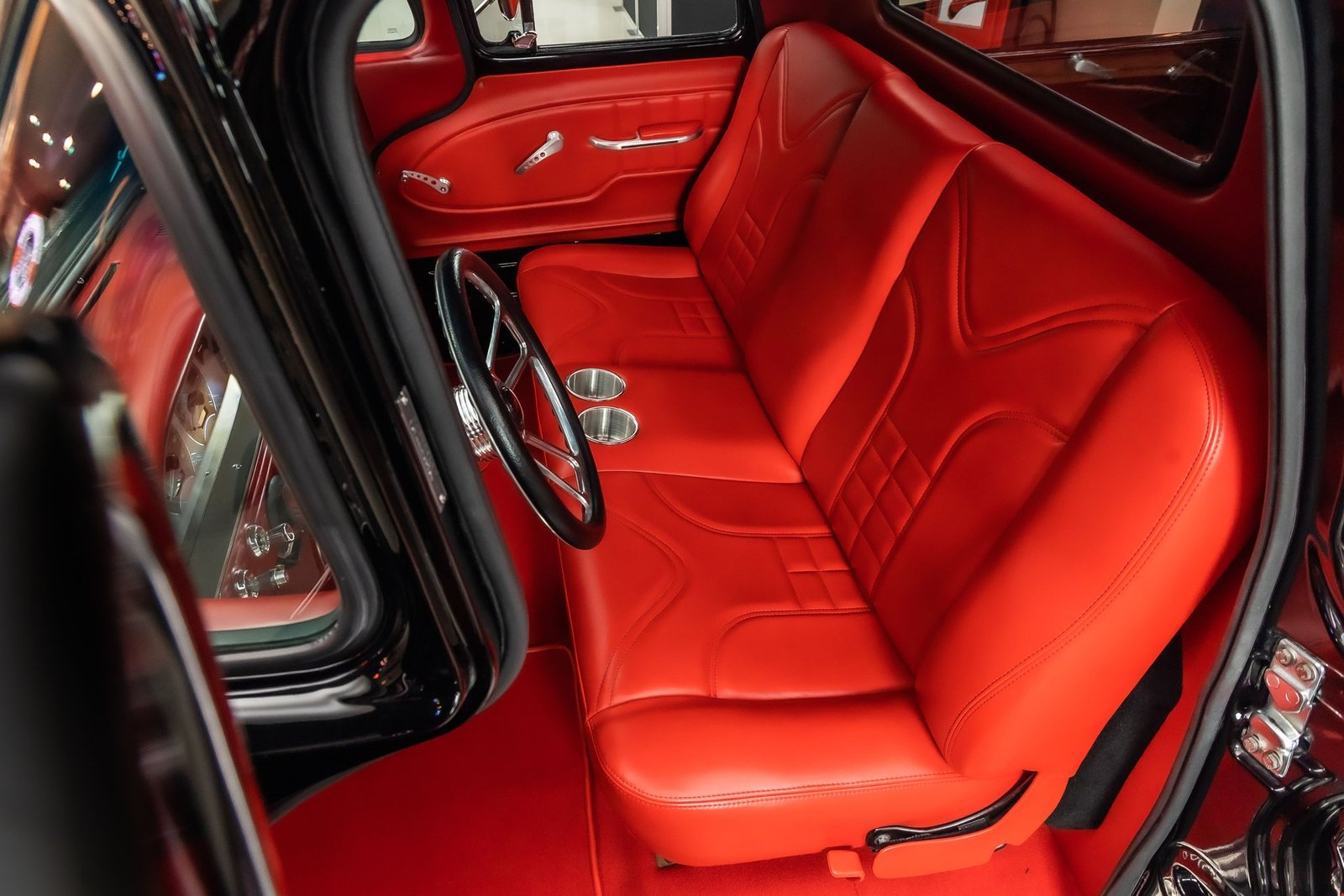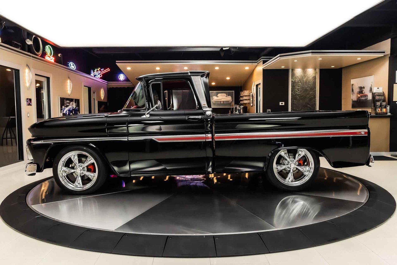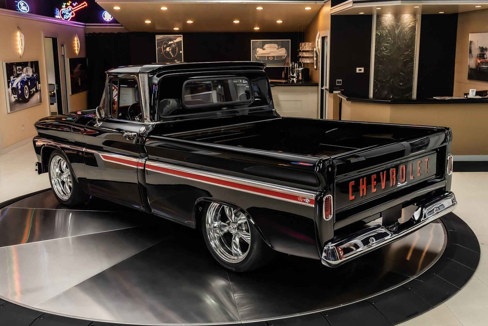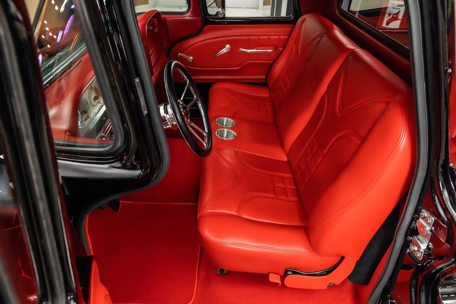 Finished in black with tasteful chrome accents, the exterior presents a clean, aggressive look that highlights the C-10’s timeless design. Inside, the custom red interior adds a bold contrast and provides a comfortable, well-finished cabin with modern touches. From the oak bed floor to the detailed undercarriage, this pickup reflects the level of care and attention expected from a high-quality restoration built to be driven and enjoyed.