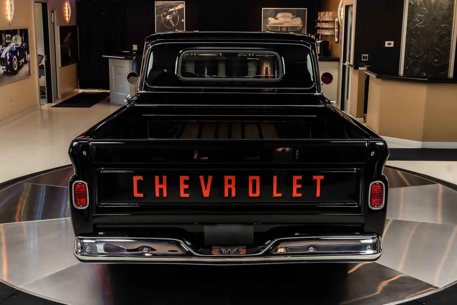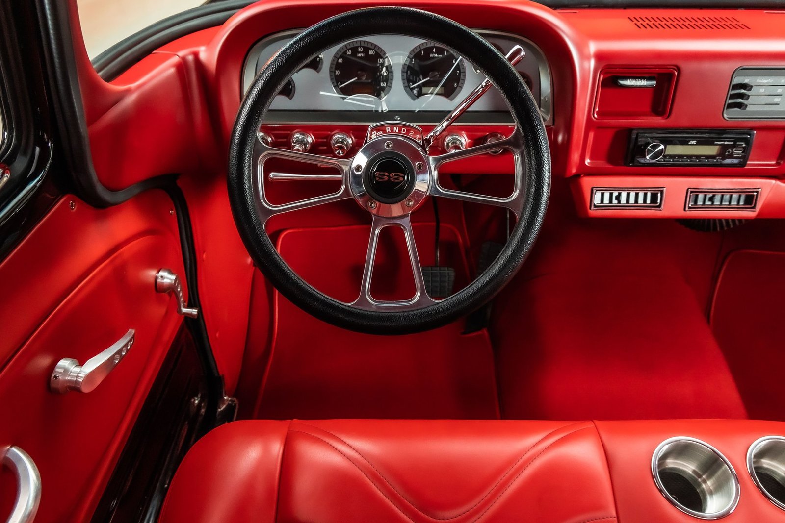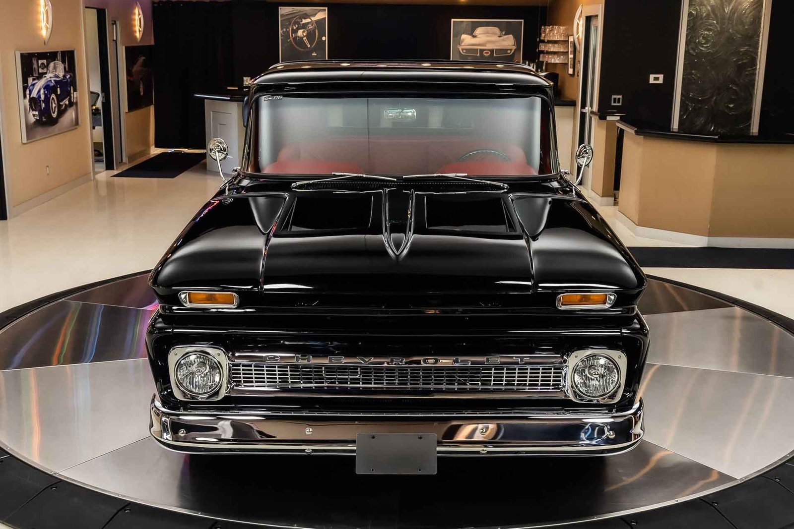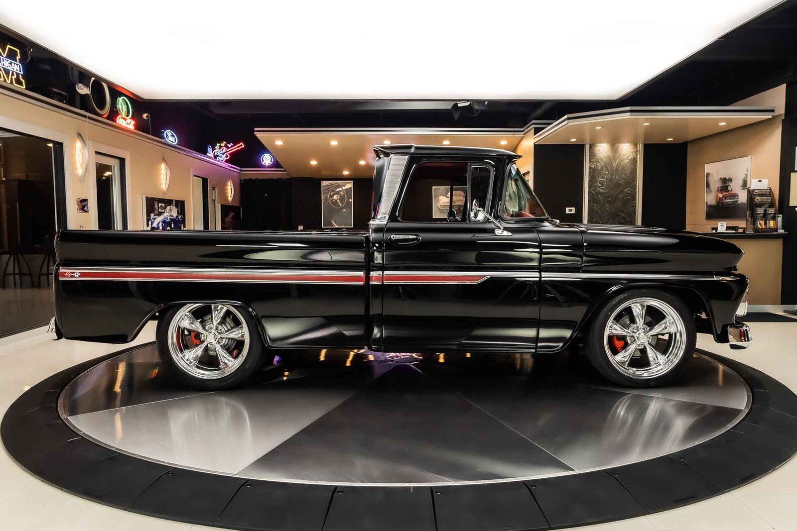 Finished in black with tasteful chrome accents, the exterior presents a clean, aggressive look that highlights the C-10’s timeless design. Inside, the custom red interior adds a bold contrast and provides a comfortable, well-finished cabin with modern touches. From the oak bed floor to the detailed undercarriage, this pickup reflects the level of care and attention expected from a high-quality restoration built to be driven and enjoyed.