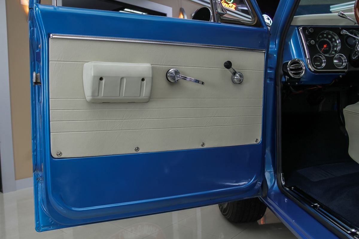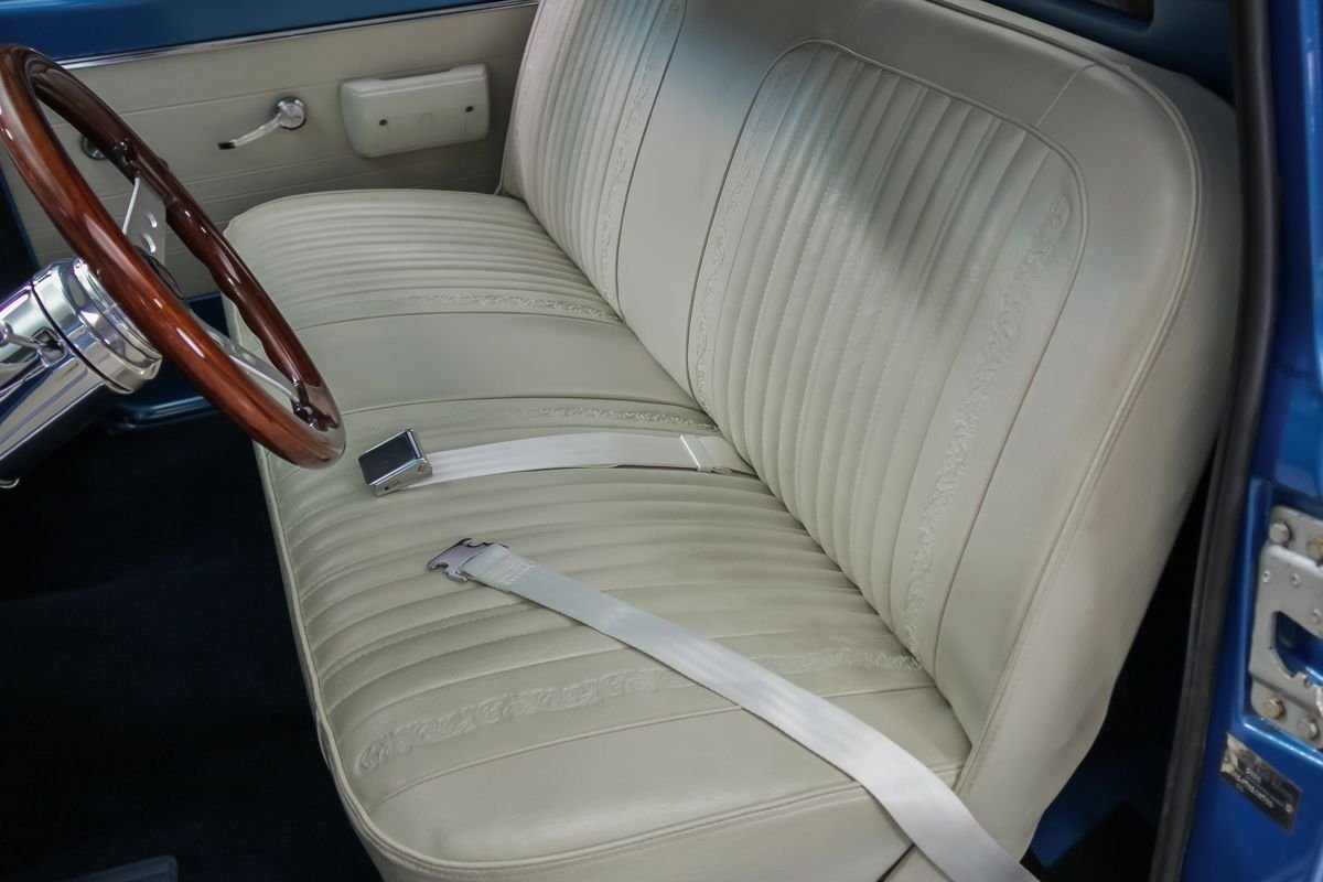 Finished in a medium blue metallic exterior, the truck presents with straight bodywork, excellent trim, and a classic stance. Inside, the white and blue interior closely mirrors the original factory look, featuring restored upholstery, a column shifter, and a clean, detailed dashboard. This C-10 delivers an authentic late-1960s pickup experience, restored to be driven, enjoyed, and proudly shown.