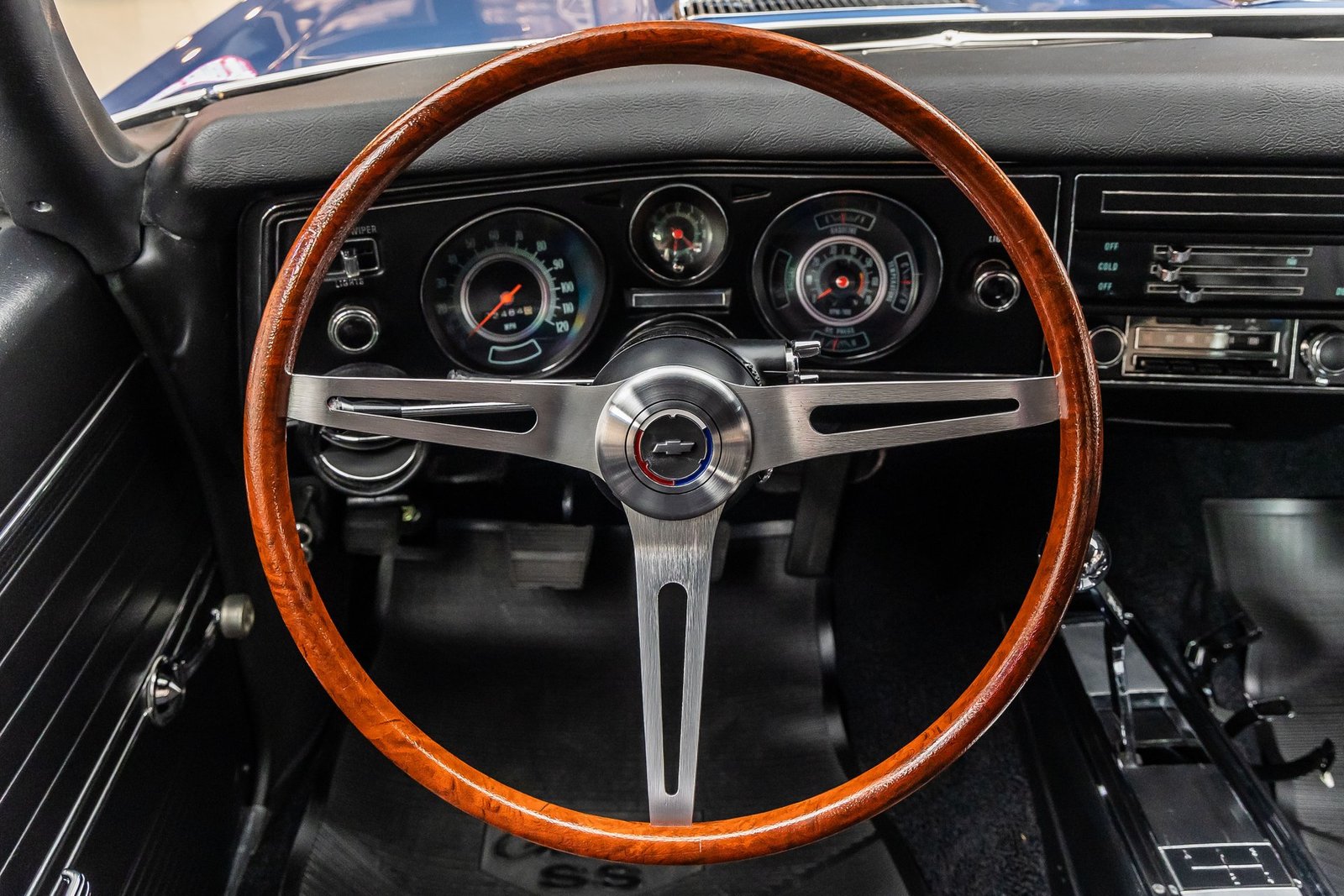 This example is a documented Super Sport that has undergone a complete, no-expense-spared frame-off restoration, resulting in a car that presents at an exceptionally high level. Finished in Dark Blue Metallic with a contrasting white side stripe, the exterior highlights the Chevelle’s muscular proportions while remaining true to its factory-correct appearance. The overall fit and finish reflect the care taken to preserve originality throughout the build.