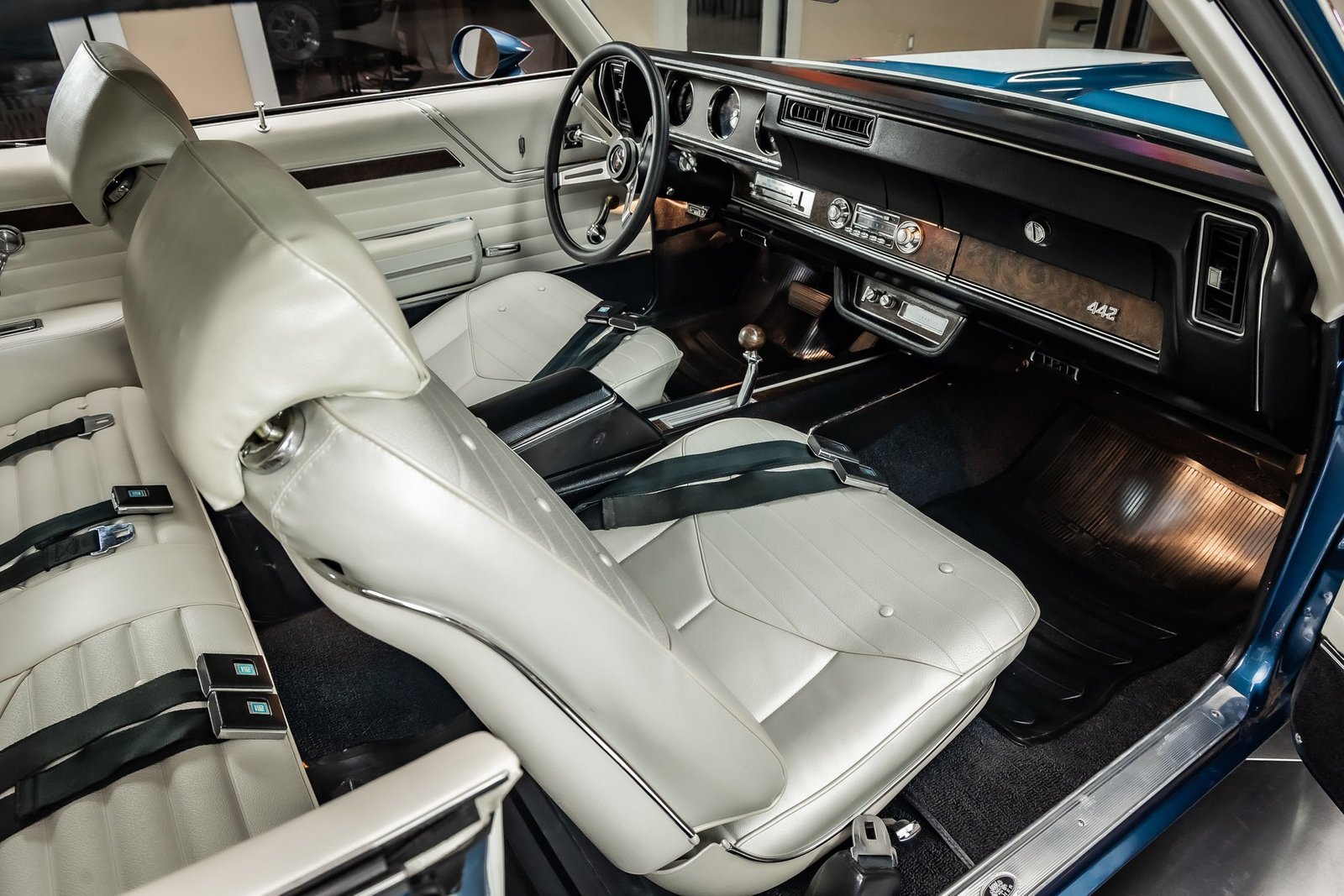 Finished in a striking blue exterior accented by white stripes and a white top, this 442 has a commanding presence that immediately captures attention. The classic color combination complements the car’s muscular body lines, while the frame-off restoration is evident in the crisp presentation and overall fit and finish. This is the kind of car that looks just as impressive rolling into a show as it does sitting still.